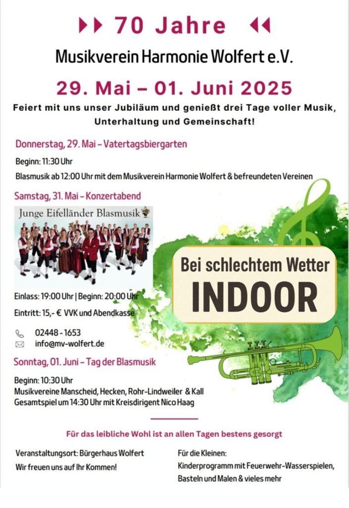 Am Sonntag, 01.06.2025 eröffneten wir den Tag der Blasmusik mit passenden Frühschoppenklängen. Trotz der „frühen“ Uhrzeit fanden schon sehr viele Gäste den Weg nach Wolfert, sodass uns auch hier der verdiente Applaus sicher war.